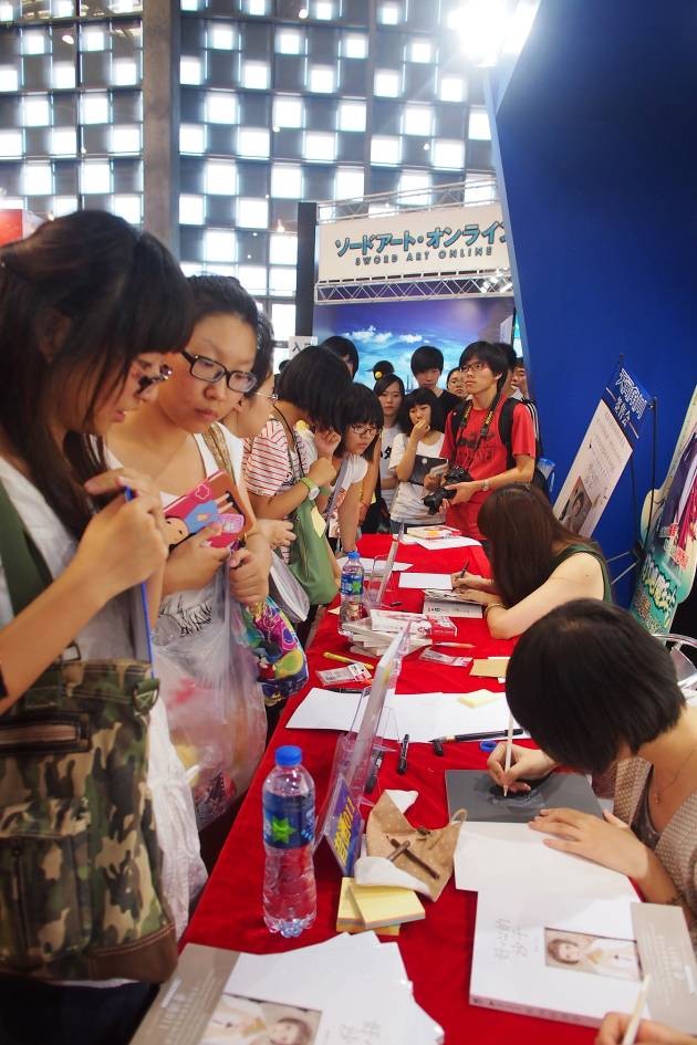 相比三年前首次亮相中國國際動漫游戲博覽會,向讀者們推出的僅是輕小說圖書,發(fā)展至今的天聞角川已經(jīng)實現(xiàn)了系列書籍的規(guī)模化、作品類型與題材的多樣化。除引進優(yōu)秀作品外,天聞角川還致力于在原創(chuàng)輕小說、漫畫、繪本、畫集、雜志等方面不斷推出精品暢銷書,如Buddy創(chuàng)作的漫畫《初·末ONCE AGAIN》、昔酒011創(chuàng)作的繪本《好心的沙子》、呀呀創(chuàng)作的畫集《花·女詞》等,都是優(yōu)秀的原創(chuàng)作品,均將在本場展會亮相。天聞角川在一百多平米的展位里,以精心的布置和擺放,向讀者展示了近800種的圖書。專門針對本場展會特別首發(fā)的人氣圖書《刀劍神域11》和《KEI畫集 mikucolor》,以及今年首度推出的“輕文學”“天驕書坊”新書系,在開展第一天就被讀者一搶而空,工作人員又緊急安排補貨。天聞角川向大家呈現(xiàn)動漫圖書的王國,讓讀者盛夏暢游書海,快樂充實!